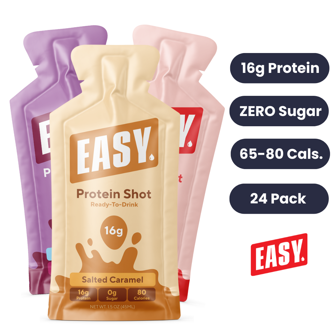 Easy Protein is a ready-to-drink liquid protein shot made with hydrolyzed collagen peptides. Each 1.5 ounce pouch delivers 16g of protein with 0g sugar, 0-4g carbs, and just 65 calories. It’s a convenient, fast-absorbing source of complete protein — no mixing, no cleanup..