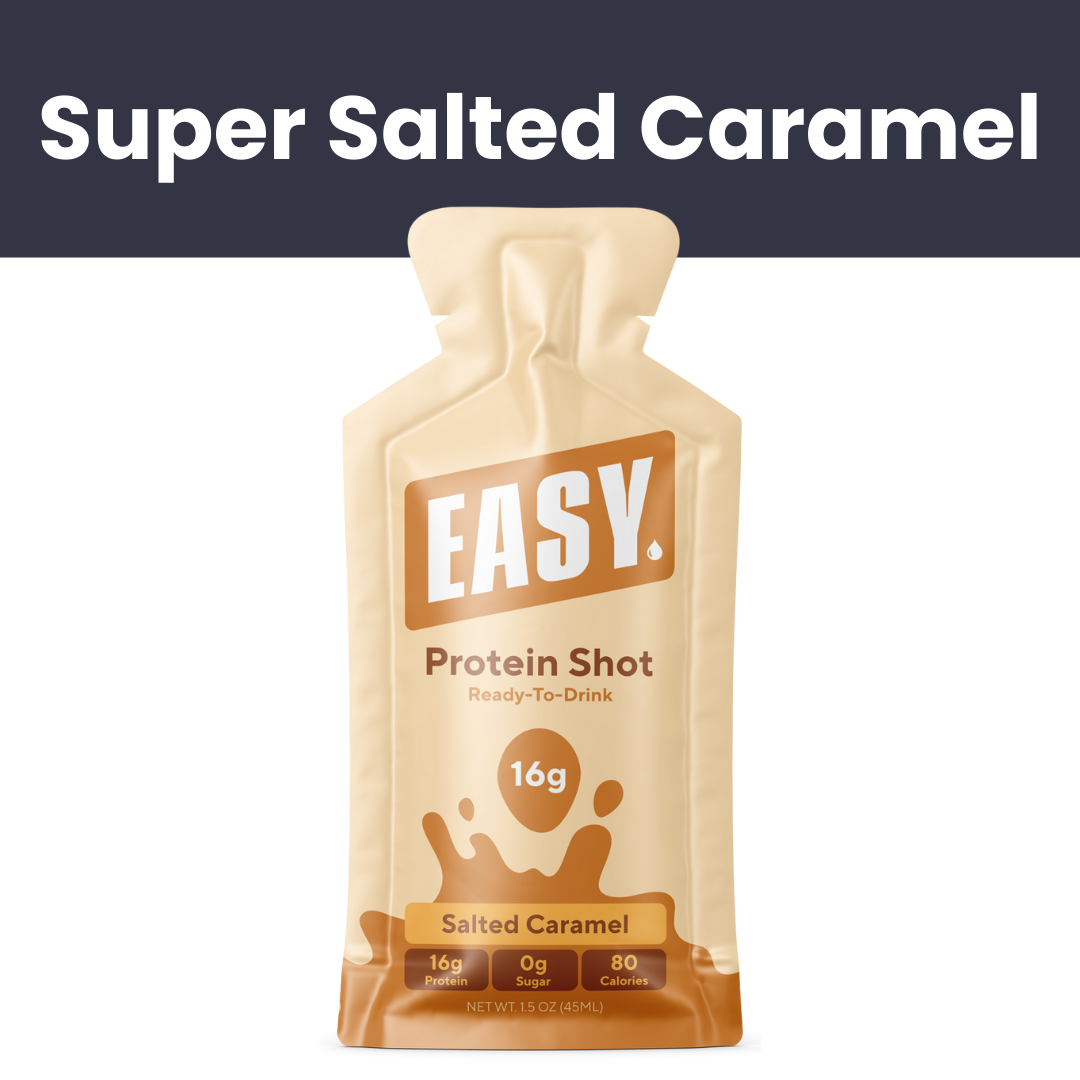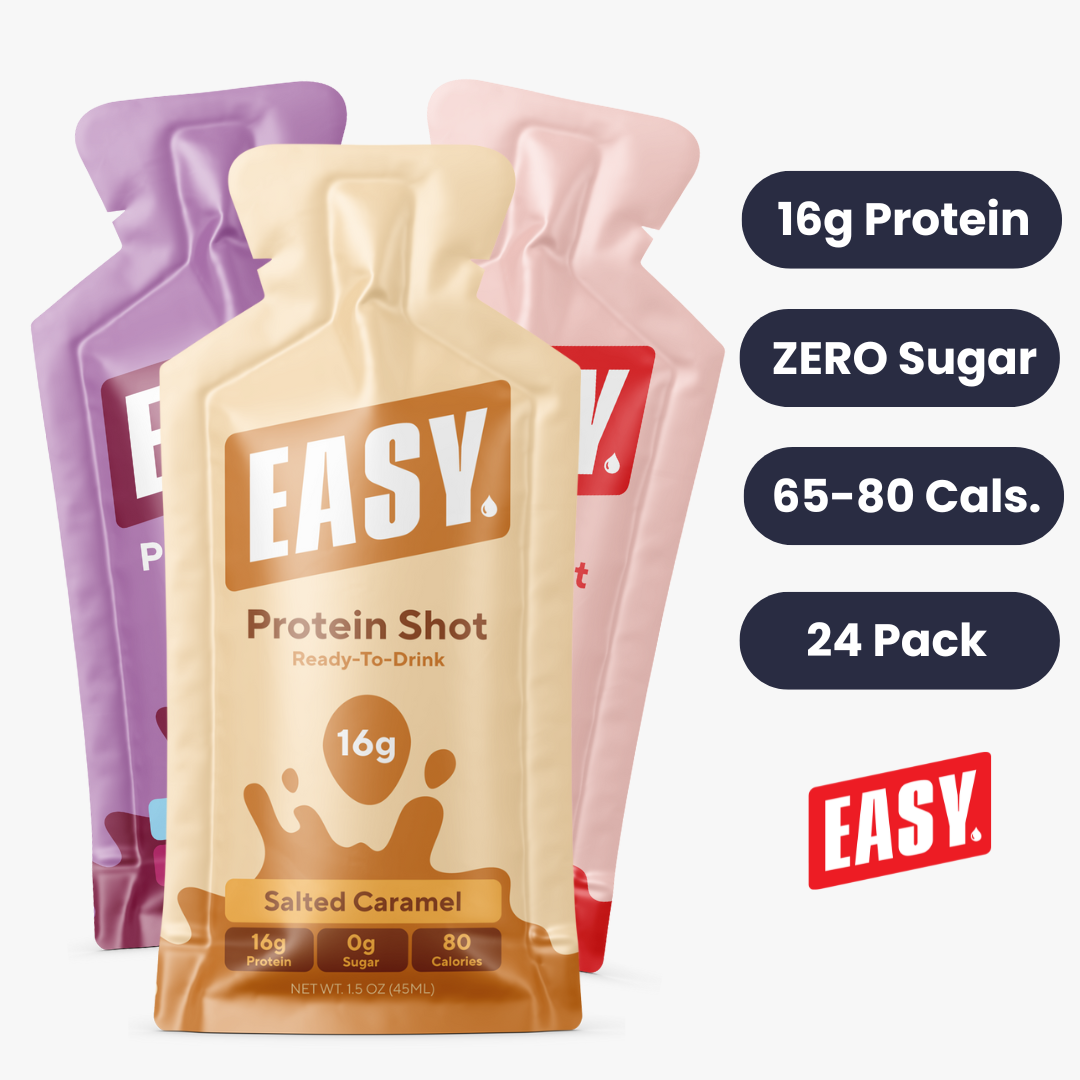 Easy Protein is a ready-to-drink liquid protein shot made with hydrolyzed collagen peptides. Each 1.5 ounce pouch delivers 16g of protein with 0g sugar, 0-4g carbs, and just 65 calories. It’s a convenient, fast-absorbing source of complete protein — no mixing, no cleanup..